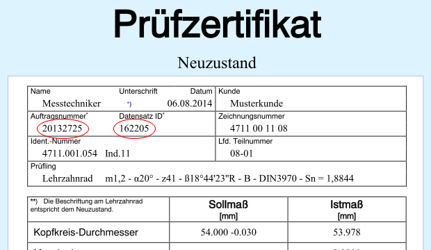 Um Ihr Prüfzertifikat als Datei im PDF-Format herunterladen zu können benötigen Sie die von uns vergebene Auftragsnummer und die von uns vergebene Datensatz-ID. Ab Ende 2024 kann die Auftragsnummer auch mit der Zeichenfolge 11A11 oder 12A11 beginnen, tragen sie diese so ein wie auf dem Zertifikat abgedruckt.