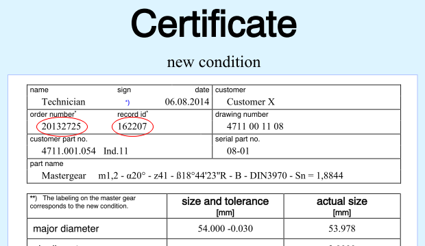 In order to download your inspection certificate as a PDF file, you need the Order Number and the Record ID issued by us. From December 2024 on the order number may start with 11A11 or 12A11, please enter it as printed on the certificate.